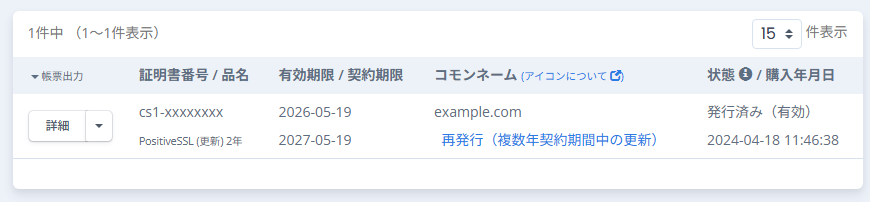 証明書の有効期限が近づくと、SSLストア管理画面の証明書一覧に、再発行手続き用のリンクが表示されます。