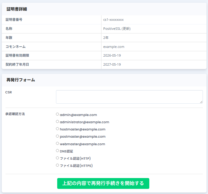 証明書一覧画面に表示される「再発行」リンクより、契約期間中の証明書再発行手続きを開始できます。